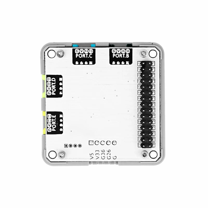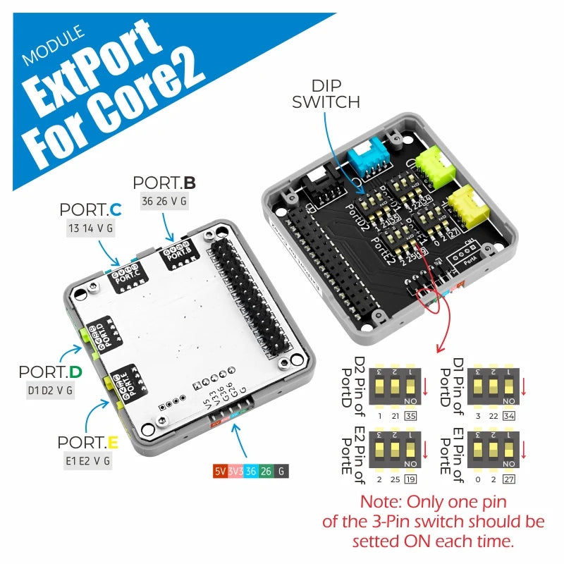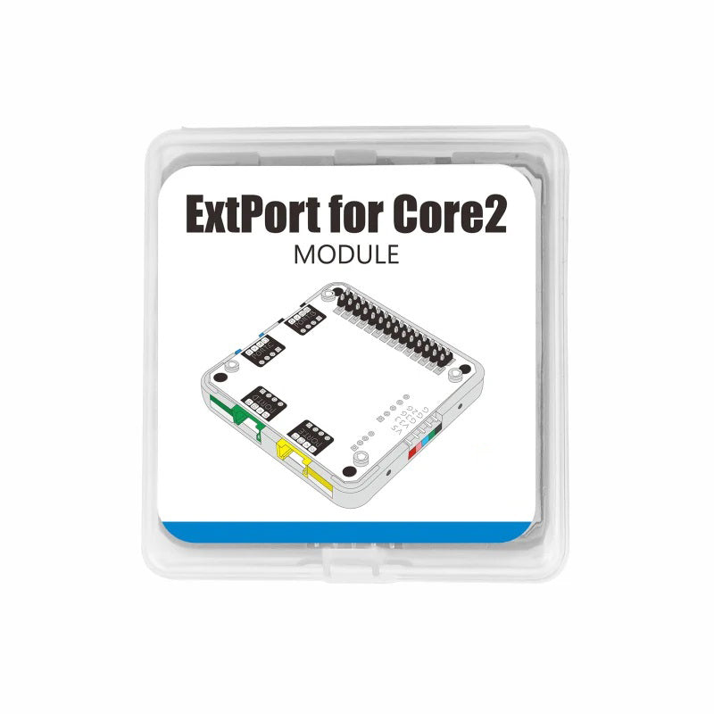 ExtPort For Core2 is an expansion module for M5Stack Core2 converting to Grove interface. It provides PortB/C/D/E 4 Grove interfaces, and PortD/E can be configured with different GPIOs via internal dip switches.