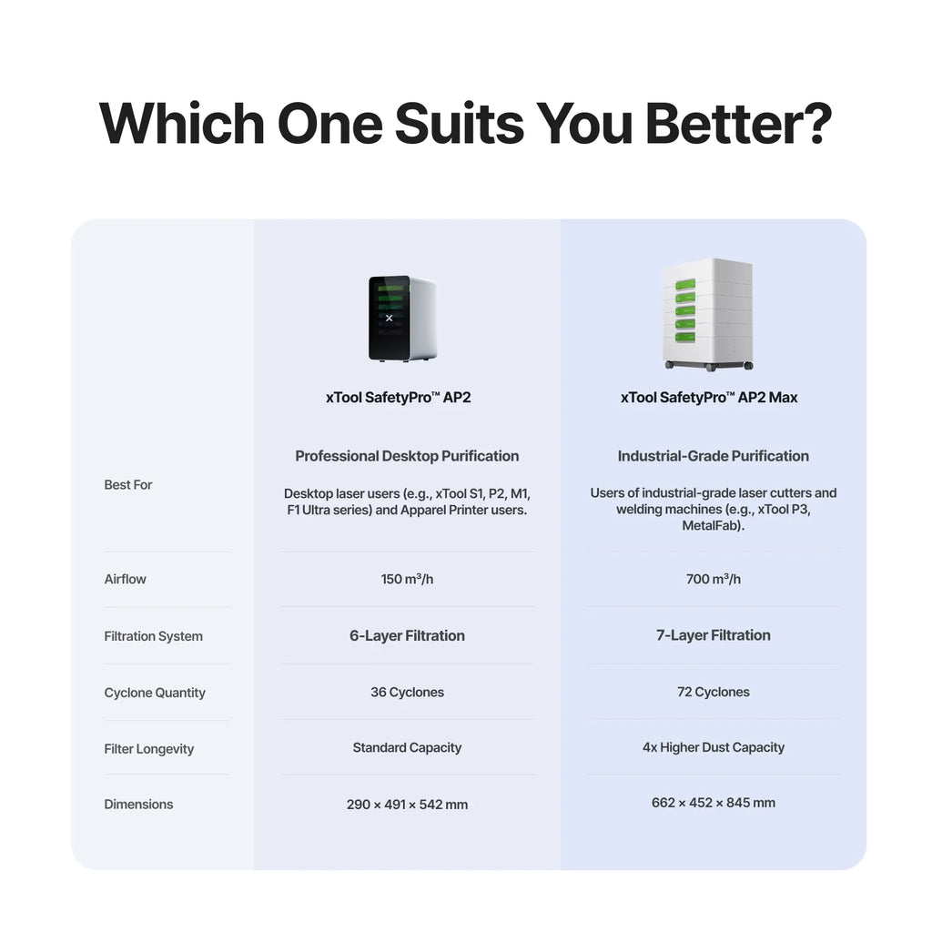 - Dual Performance Tiers: Choose the 150m³/h AP2 for desktop laser machine or the 700m³/h AP2 Max for industrial-grade laser cutter.